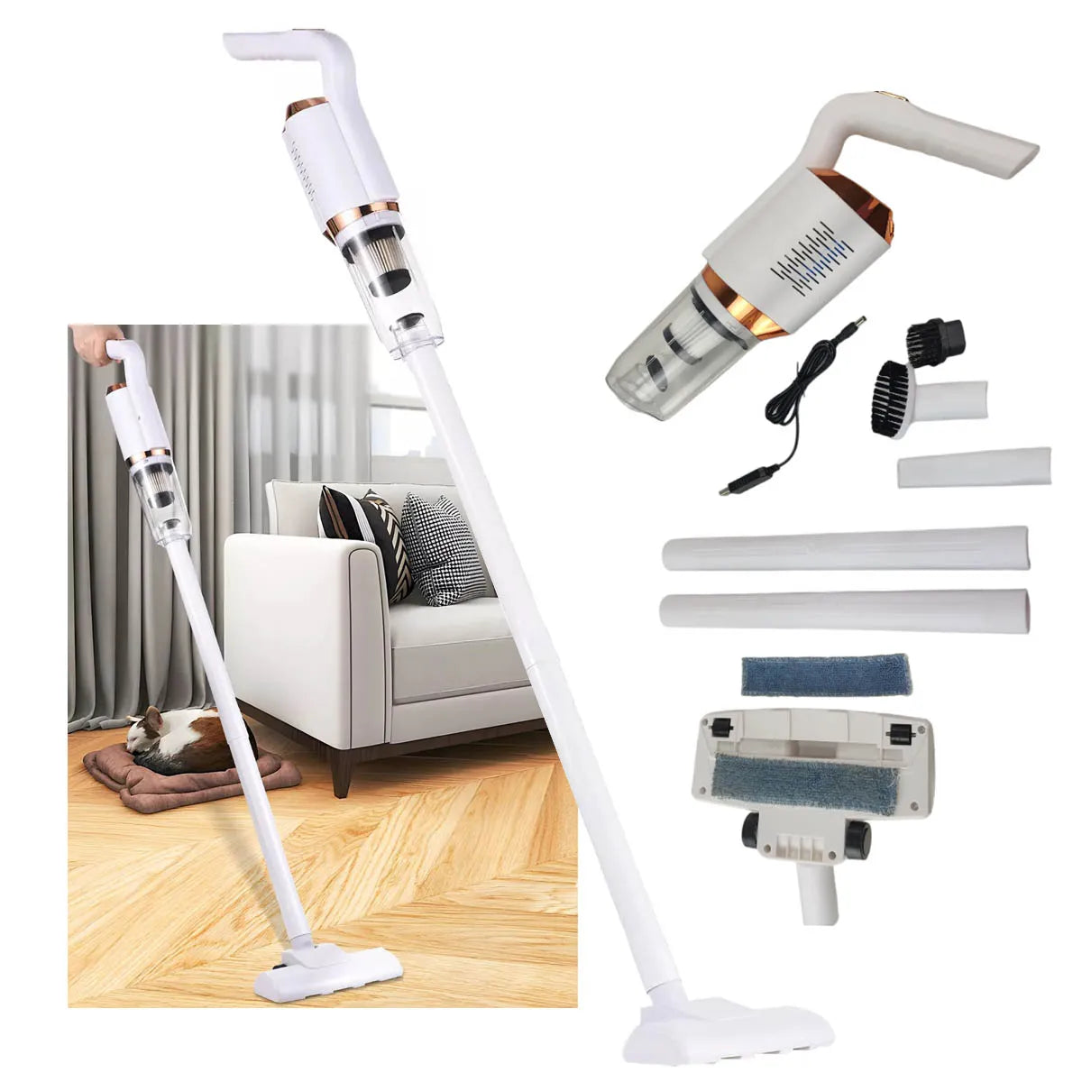Con la Aspiradora portátil multifuncional, limpiar tu hogar nunca ha sido tan fácil. No más cables molestos ni cambiar enchufes. Esta aspiradora es ligera, portátil y eficiente. Su tecnología de succión y arrastre en una sola pasada hace que elimines polvo y suciedad en segundos. Además, es ideal para todo tipo de suelos, desde alfombras hasta baldosas.